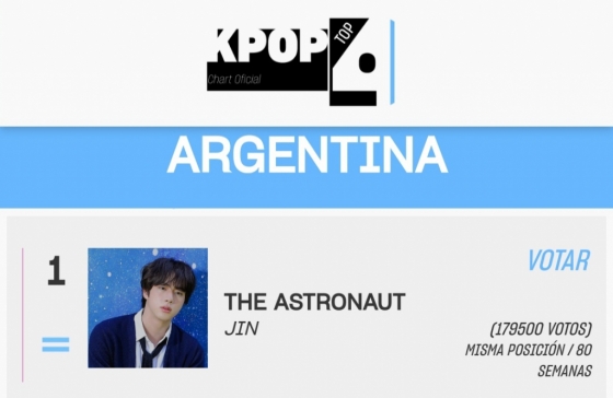 진이 입대전 발매한 첫 솔로 싱글 '디 애스트로넛'은 최근 아르헨티나(Argentine) 'Top 40 Kpop' 차트에서 80주 연속 1위를 기록했다.
