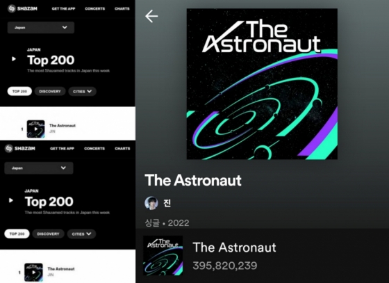 진의 '디 애스트로넛'은 지난 4월 5일 세계 최대 음원 검색 플랫폼 샤잠(Shazam) '일본 TOP200' 차트에서 1위에 다시 오르며, 다음날까지 이틀 연속 1위를 차지했다.