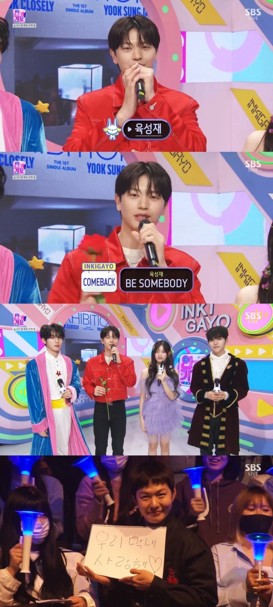 이어 육성재는 타이틀곡 '비 썸바디(BE SOMEBODY)'에 대해 "어두운 길을 지나 새로운 길을 찾았고, 그 새로운 길을 향해 도전한다는 의미를 담고 있다"라고 소개했다. 특히 그는 "무대에 특별한 손님이 있다"는 MC들의 말에 "그냥 아는 형이 가다가 들려서 응원을 와줬다"면서 본 무대를 기대케 만들었다.