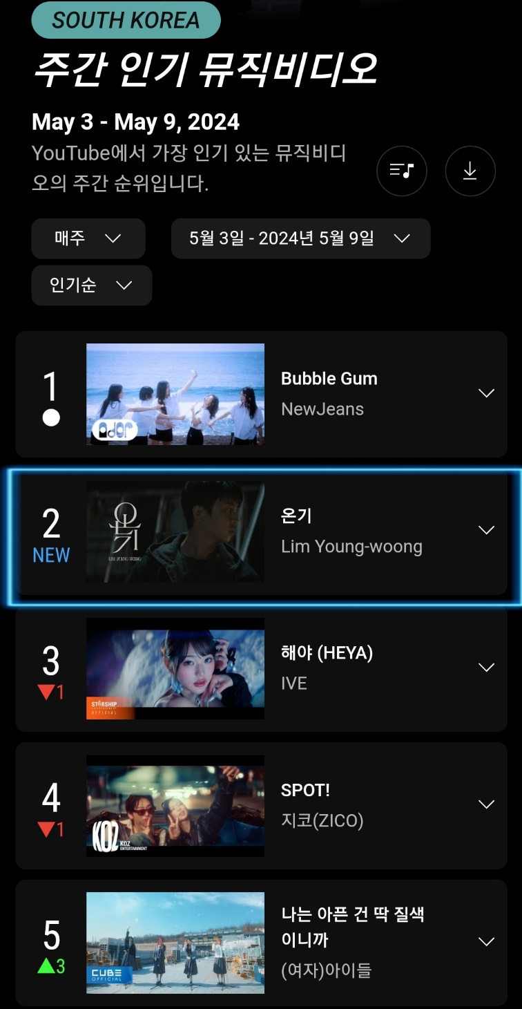 임영웅의 '온기' 뮤지비디오는 2024년 5월 3일~2024년 5월 9일 유튜브 한국 주간 인기 뮤직비디오 차트 2위를 차지했다.