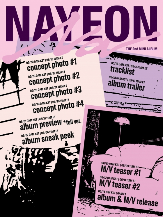 함께 공개된 타임테이블에는 티징 일정이 담겼다. 나연은 오는 16일 트랙리스트를 시작으로 18일 앨범 트레일러, 20일부터 30일까지 콘셉트 포토, 6월 7일 앨범 스니크 피크, 10일과 12일 타이틀곡 뮤직비디오 티저를 차례로 공개한다.