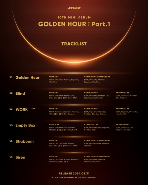 에이티즈는 14일 0시 공식 SNS를 통해 미니 10집 '골든 아워 : 파트 1(GOLDEN HOUR : Part.1)'의 트랙리스트 포스터를 공개했다.