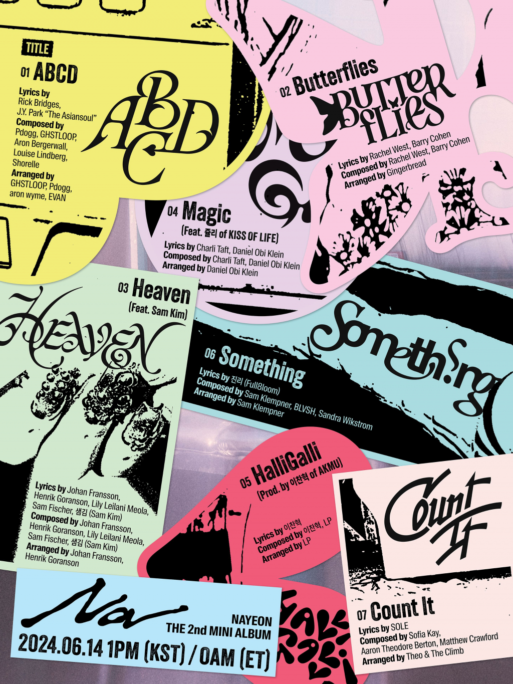나연의 새 앨범에는 타이틀곡 'ABCD'를 비롯해 'Butterflies'(버터플라이즈), 'Heaven (Feat. Sam Kim)', 'Magic (Feat. 쥴리 of KISS OF LIFE)', 'HalliGalli (Prod. by 이찬혁 of AKMU)', 'Something'(썸씽), 'Count It'까지 총 7곡이 수록된다.