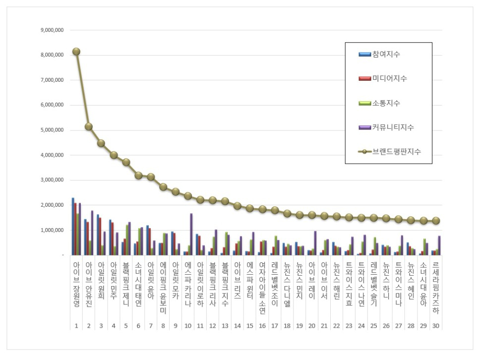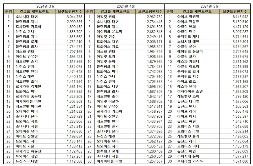 2024년 5월 걸그룹 개인 브랜드평판 30위 순위는 아이브 장원영, 아이브 안유진, 아일릿 원희, 아일릿 민주, 블랙핑크 제니, 소녀시대 태연, 아일릿 윤아, 에이핑크 윤보미, 아일릿 모카, 에스파 카리나, 아일릿 이로하, 블랙핑크 리사, 블랙핑크 지수, 아이브 리즈, 에스파 윈터, 여자아이들 소연, 레드벨벳 조이, 뉴진스 다니엘, 뉴진스 민지, 아이브 레이, 아이브 이서, 뉴진스 해린, 트와이스 지효, 트와이스 나연, 레드벨벳 슬기, 뉴진스 하니, 트와이스 미나, 뉴진스 혜인, 소녀시대 윤아, 르세라핌 카즈하 순으로 분석됐다.