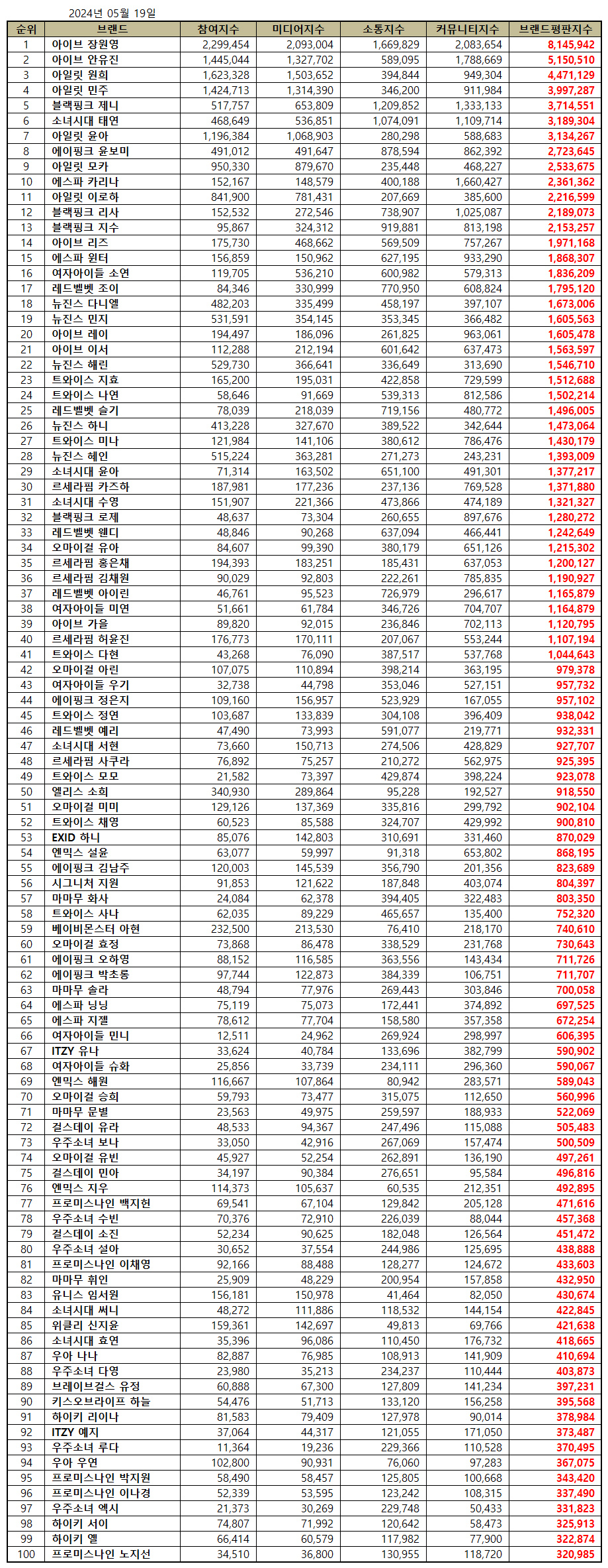 2024년 5월 걸그룹 개인 브랜드평판 100위 브랜드는 아이브 장원영, 아이브 안유진, 아일릿 원희, 아일릿 민주, 블랙핑크 제니, 소녀시대 태연, 아일릿 윤아, 에이핑크 윤보미, 아일릿 모카, 에스파 카리나, 아일릿 이로하, 블랙핑크 리사, 블랙핑크 지수, 아이브 리즈, 에스파 윈터, 여자아이들 소연, 레드벨벳 조이, 뉴진스 다니엘, 뉴진스 민지, 아이브 레이, 아이브 이서, 뉴진스 해린, 트와이스 지효, 트와이스 나연, 레드벨벳 슬기, 뉴진스 하니, 트와이스 미나, 뉴진스 혜인, 소녀시대 윤아, 르세라핌 카즈하, 소녀시대 수영, 블랙핑크 로제, 레드벨벳 웬디, 오마이걸 유아, 르세라핌 홍은채, 르세라핌 김채원, 레드벨벳 아이린, 여자아이들 미연, 아이브 가을, 르세라핌 허윤진, 트와이스 다현, 오마이걸 아린, 여자아이들 우기, 에이핑크 정은지, 트와이스 정연, 레드벨벳 예리, 소녀시대 서현, 르세라핌 사쿠라, 트와이스 모모, 엘리스 소희, 오마이걸 미미, 트와이스 채영, EXID 하니, 엔믹스 설윤, 에이핑크 김남주, 시그니처 지원, 마마무 화사, 트와이스 사나, 베이비몬스터 아현, 오마이걸 효정, 에이핑크 오하영, 에이핑크 박초롱, 마마무 솔라, 에스파 닝닝, 에스파 지젤, 여자아이들 민니, ITZY 유나, 여자아이들 슈화, 엔믹스 해원, 오마이걸 승희, 마마무 문별, 걸스데이 유라, 우주소녀 보나, 오마이걸 유빈, 걸스데이 민아, 엔믹스 지우, 프로미스나인 백지헌, 우주소녀 수빈, 걸스데이 소진, 우주소녀 설아, 프로미스나인 이채영, 마마무 휘인, 유니스 임서원, 소녀시대 써니, 위클리 신지윤, 소녀시대 효연, 우아 나나, 우주소녀 다영, 브레이브걸스 유정, 키스오브라이프 하늘, 하이키 리이나, ITZY 예지, 우주소녀 루다, 우아 우연, 프로미스나인 박지원, 프로미스나인 이나경, 우주소녀 엑시, 하이키 서이, 하이키 옐, 프로미스나인 노지선 순으로 분석됐다.