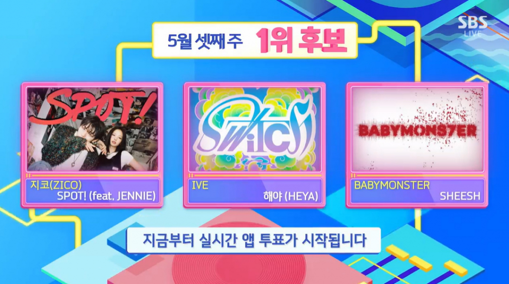 이날 '인기가요' 1위 후보에 오른 아티스트는 총 세 팀이다. 지코는 블랙핑크 제니가 피처링으로 참여한 'SPOT!', 아이브는 '해야', 베이비몬스터는 '쉬쉬(SHEESH)'로 '인기가요' 1위 후보에 이름을 올렸다.