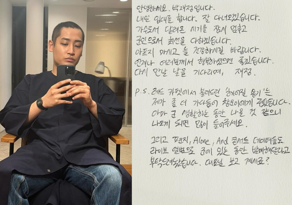 이날 박재정은 "잘 다녀오겠다. 가수로서 달려온 시기를 잠시 멈추고 군인으로서 최선을 다하겠다. 아프지 마시고 늘 건강하시길 바란다. 언제나 여러분께서 행복하셨으면 좋겠다. 다시 만날 날을 기다리며"라고 밝혔다.