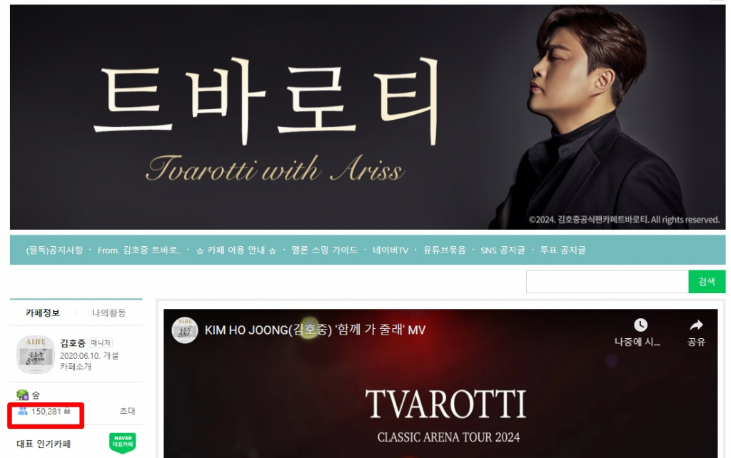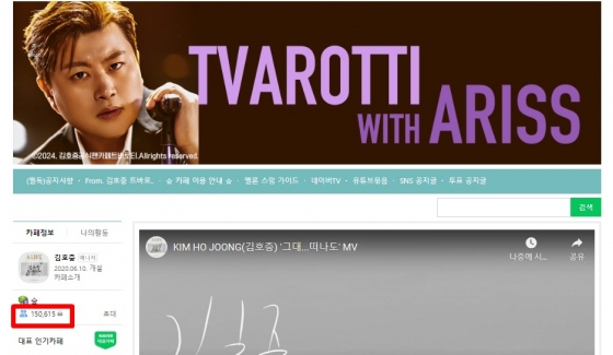 21일 스타뉴스 확인 결과, 이날 김호중 팬클럽 '아리스'가 활동하는 온라인 카페 '트바로티'의 총 회원 수는 15만 276명을 나타내고 있다. 이는 전날에 비해 330명 이상 감소한 수치다.