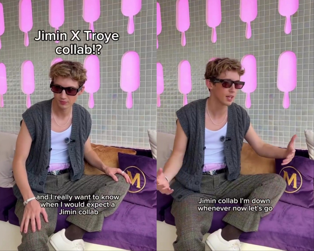 프리미엄 아이스크림 브랜드 매그넘과 협업 중인 팝스타 트로이 시반(Troye Sivan)은 최근 프랑스 칸에서 열린 매그넘 라이브 리스닝 파티에서 지민과의 컬래버레이션에 대한 질문에 ''지민과 컬래버, 좋아 언제든지, 지금 레츠 고''(Jimin collab, I am down whenever, now Let's go)라고 답했다.