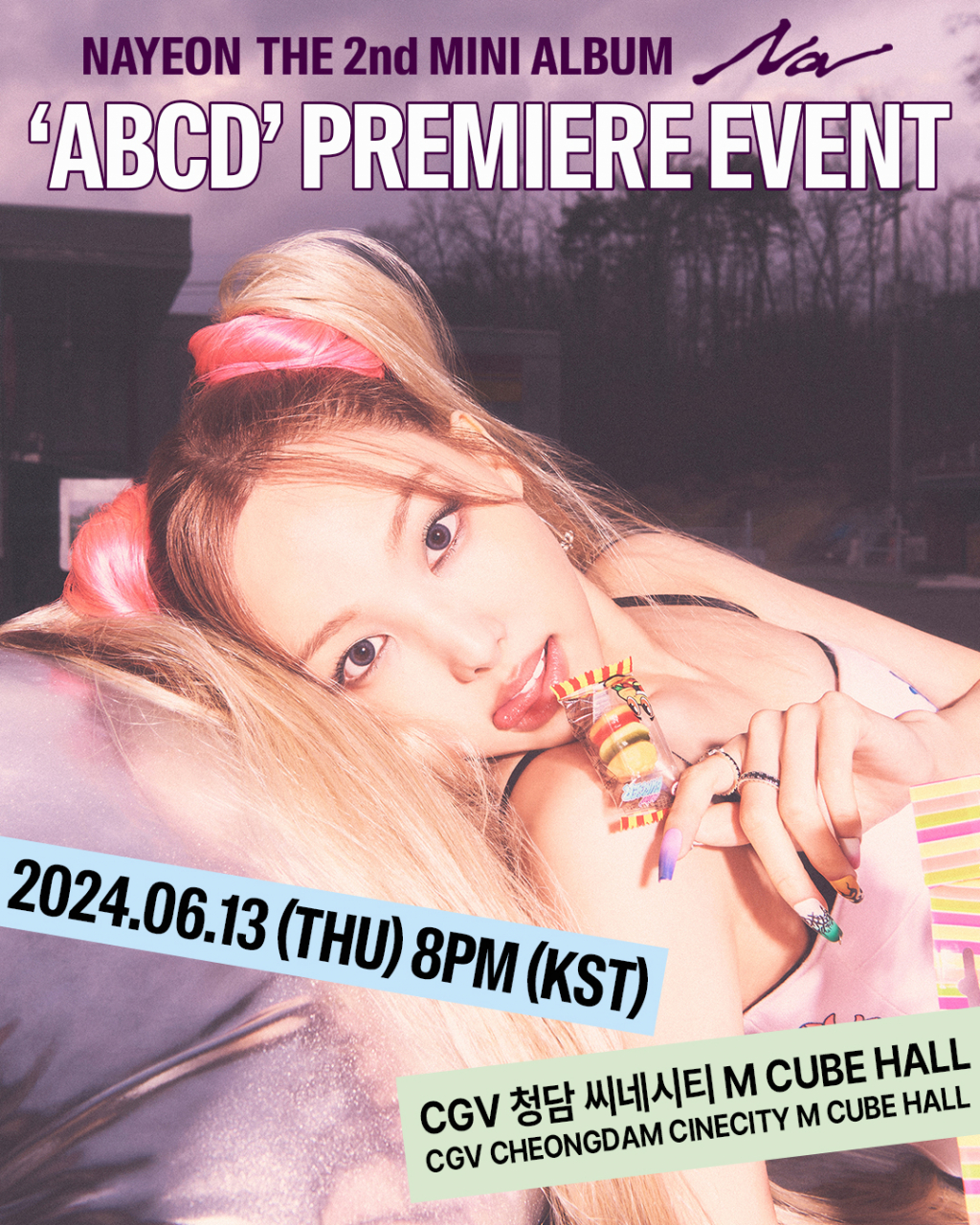 이에 따르면 나연은 컴백을 하루 앞둔 6월 13일 오후 8시 서울 강남구 신사동 CGV 청담 씨네시티 M CUBE HALL에서 'NAYEON THE 2nd MINI ALBUM [NA] 'ABCD' PREMIERE EVENT'(나연 미니 2집 [나] '에이비씨디' 프리미어 이벤트)를 연다. 이번 행사 모습을 앨범 발매 당일인 14일 오후 8시 트와이스 공식 유튜브 채널을 통해 온라인 송출하고 더욱 많은 이들과 공유할 예정이다.