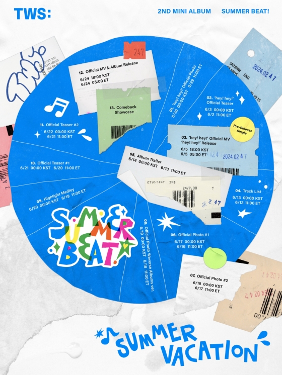 TWS의 미니 2집 'SUMMER BEAT!'는 6월 24일 오후 6시 발매된다. 청량한 음악과 비주얼로 인기를 끈 TWS인 만큼 올여름 이들이 들려줄 'SUMMER BEAT!'에 큰 관심이 쏠린다. 여름방학 생활계획표를 떠올리게 하는 스케줄러 이미지 역시 TWS의 시원한 이야기를 기대케 했다.