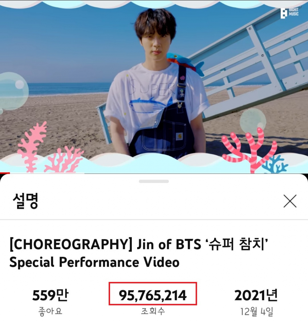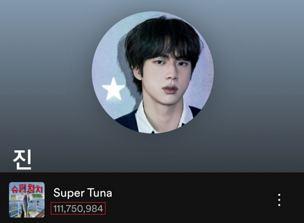 진의 자작곡이자 솔로곡 '슈퍼 참치'는 최근 세계 최대 음원 플랫폼 스포티파이(Spotify)에서 1억 1100만 스트리밍을 돌파, 5월 29일 기준 1억 1175만 스트리밍을 넘어서며 기록 행진을 이어갔다.