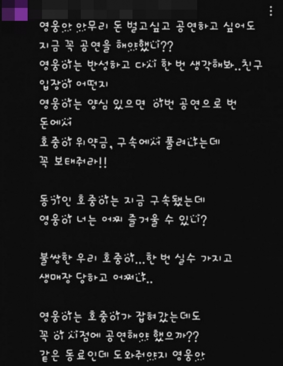 김호중 팬 A씨는 "영웅아, 아무리 돈 벌고 싶고 공연하고 싶어도 지금 꼭 공연을 해야 했니? 영웅이는 반성하고 다시 한번 생각해봐. 친구 입장이 어떤지"라고 라고 했다.