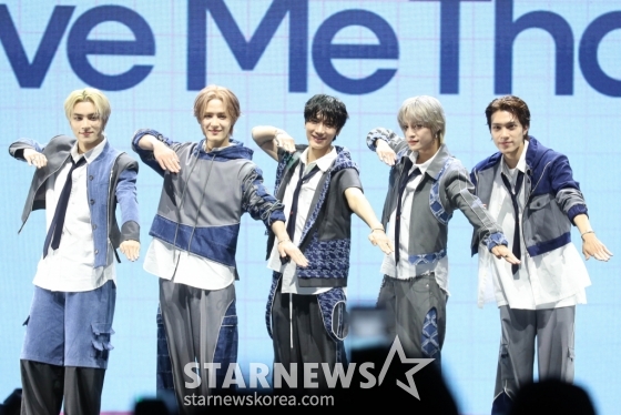 그룹 웨이션브이(WayV) 샤오쥔, 쿤, 텐, 양양, 헨드리가 3일 오후 서울 용산구 블루스퀘어에서 다섯 번째 미니앨범 'Give Me That' 발매 기념 쇼케이스를 열고 포즈를 취하고 있다. 2024.06.03 /사진=임성균