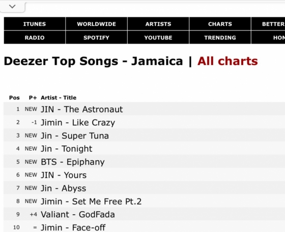 진의 첫 솔로 싱글 '디 애스트로넛'(The Astronaut)은 지난 7일 '디저 탑 송 자메이카' 차트(Deezer Top Songs Jamaica)에서 1위를 차지했다.
