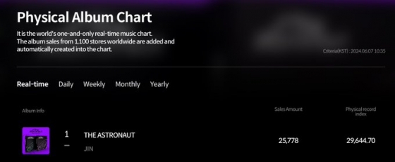 진의 '디 애스트로넛'은 같은 날 한터 피지컬 음반 차트에서도 1위에 오르며 제대 후 시작될 솔로 활동에 박차를 가했다.