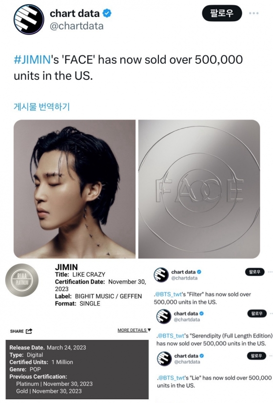 지민의 솔로 앨범 '페이스'의 타이틀곡 '라이크 크레이지'는 앞서 지난 2023년 8월 미국에서 100만 유닛 이상 판매하며 단일곡으로 RIAA '플래티넘' 인증 자격을 받았으나 소속사의 뒤늦은 신청으로 12월에 인증을 획득했다.