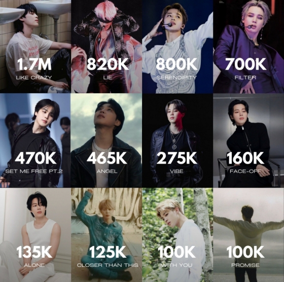 또한 지민의 솔로곡 '필터', '세렌디피티 풀랭스', '라이' 3곡이 50만 유닛 이상 판매되어 RIAA 골드 인증 자격을 획득한 상태로 이와 함께 '셋 미 프리 파트2'와 '엔젤 파트1'이 50만 유닛 판매를 목전에 두고 있다. 또다른 지민의 음원 6개까지 총 12개 음원들이 미국에서 10만 유닛 판매를 돌파하며 남다른 음원 파워를 증명했다.