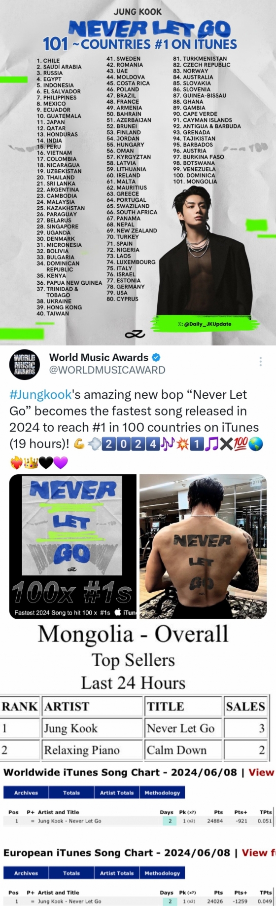 지난 7일 오후 1시 발매된 정국의 새 디지털 싱글 'Never Let Go'는 글로벌 음원 플랫폼 '아이튠즈'(iTunes)에서 총 101개 국가(지역) 아이튠즈 톱 송 차트 1위를 달성했다.