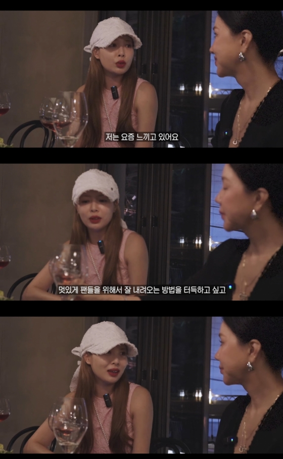 현아는 "이걸 요즘 느끼고 있다. 패들을 위해서 잘 내려오는 방법을 터득하고 싶고 내려오는데 슬프지 않았으면 좋겠다"라고 말했다. 그러자 엄정화는 "내려오지 않으면 되지"라고 응원했고, 현아는 "왜 눈물이 나지"라고 울컥했다.