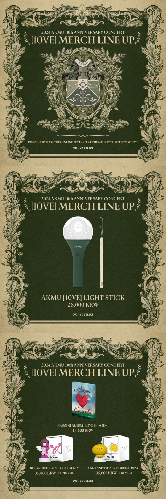 또 '2024 AKMU 10주년 콘서트 [10VE]'와 미니 3집 [LOVE EPISODE] 발매를 기념하는 신상 MD도 출시된다. 여기에 전국 투어 [AKMUTOPIA]에서 인기를 끌었던 '후라이의 꿈' MD 상품도 NEW버전으로 다시 만날 수 있다.