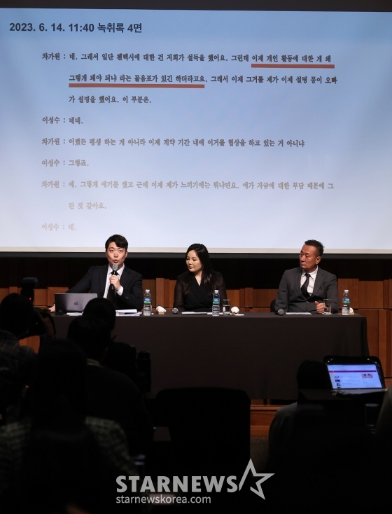 이 변호사는 차가원 회장이 이성수 CAO와 협의한 내용인 2023년 6월 14일 오전 11시 40분의 녹취록을 공개했다. 차가원 대표는 "내가 죽어라 활동해도 이게 그럼 회사가 이게 운영이 될까에 대한 두려움이 있다"라고 하자 이성수 CAO는 "자기(변백현 등)가 직접 하더라도 예를 들면 무조건 누군가 유통사는 있어야 되지 않냐"라고 말했다.