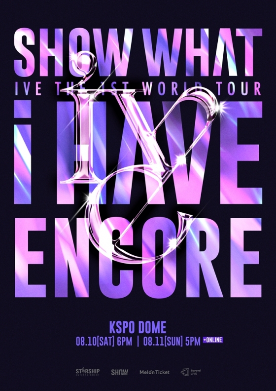 10일 소속사 스타쉽엔터테인먼트에 따르면 아이브는 오는 8월 10일과 11일 양일간 서울 송파구 방이동 올림픽공원 KSPO DOME(구 올림픽 체조경기장)에서 첫 번째 월드 투어 '쇼 왓 아이 해브'(IVE THE 1ST WORLD TOUR 'SHOW WHAT I HAVE' - ENCORE) 앙코르 공연을 개최한다. 공연을 찾지 못하는 팬들을 위해 11일 공연은 글로벌 플랫폼 '비욘드 라이브'(Beyond LIVE)에서 온라인 생중계를 진행한다.