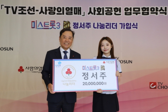 사랑의열매 사회복지공동모금회(회장 김병준)는 10일 "TV CHOSUN '미스트롯3' 진에 빛나는 가수 정서주가 2000만원을 기부하며 사랑의열매 개인 정기기부 프로그램인 나눔리더 골드에 가입했다"라고 밝혔다.