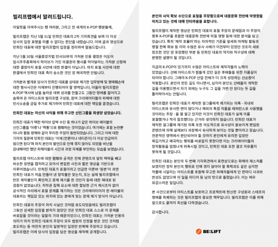 10일 오후 빌리프랩은 공식 SNS에 "표절 주장에 대한 빌리프랩의 입장"이라면서 장문의 글과 동영상을 게재했다.