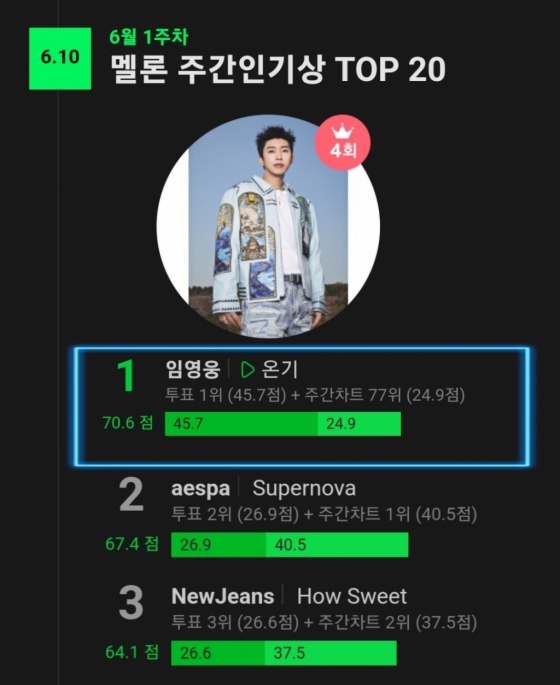 임영웅은 '온기'로 6월 1주차 멜론 주간인기상 TOP20 1위를 차지했다.