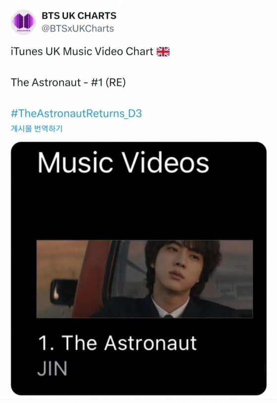 진의 첫 솔로 싱글 '디 애스트로넛'은 6월 10일 '아이튠즈 영국 뮤직비디오 차트(itunes UK Music Video chart)에서 1위를 재탈환하며 최고의 인기와 영향력을 보여줬다. 발매 후 약 1년 6개월이 되어가는 '디 애스트로넛'이 아직까지 뜨거운 사랑을 받고 있다는 사실을 입증했다.