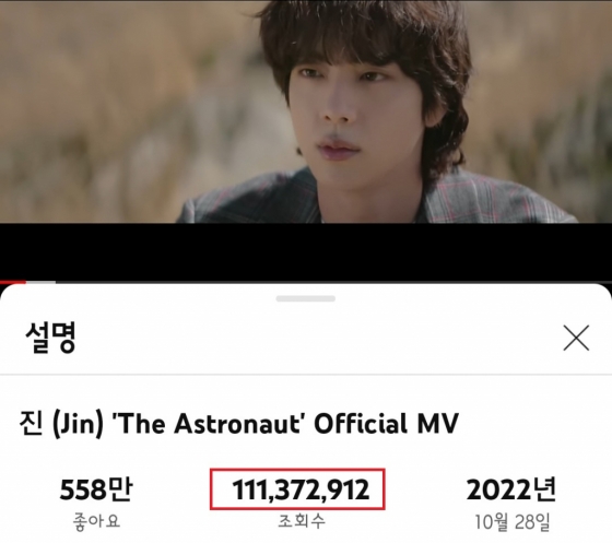 최근 진의 '디 애스트로넛' 뮤직비디오가 조회수 1억 1137만 뷰를 넘어서며 전역 후의 활동에 대한 기대감을 더하고 있다. 해당 뮤직비디오는 지구에 불시착한 '우주인'으로 등장한 진의 섬세하면서 감각적인 표정 연기가 눈길을 사로잡는다. 특히 신비하고 감각적인 사운드와 영상미가 마치 SF 영화를 보는 듯한 감상을 불러일으키며 큰 화제를 모았다.