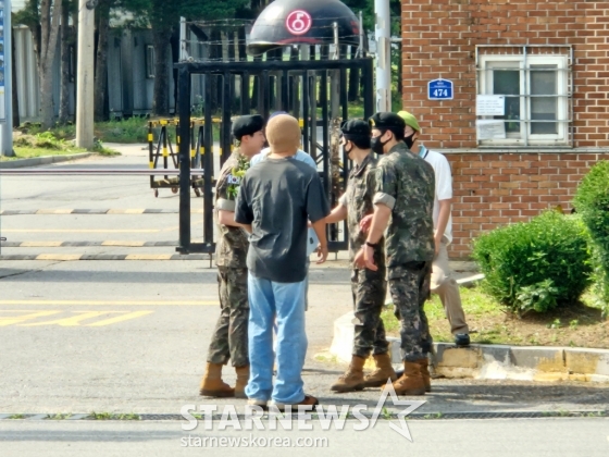 이날 사회복무요원으로 대체 복무 중인 슈가를 제외한 RM, 제이홉, 지민, 뷔, 정국은 진의 전역을 축하하기 위해 제5보병사단을 찾았다. RM, 제이홉, 뷔는 사복을, 지민과 정국은 군복을 입고 취재진 앞에 나타났다.