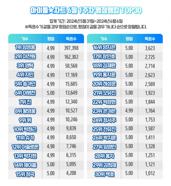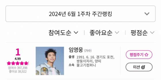 임영웅은 지난 6월 7일부터 6월 13일까지 집계된 6월 1주차 아이돌차트 평점랭킹에서 39만 7398표를 획득, 1위를 차지했다.