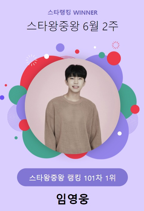 임영웅은 지난 7일 오후 3시 1분부터 6월 14일 오후 3시까지 진행된 6월 2주차(101차) 스타왕중왕 랭킹 투표에서 23만 7807표를 얻고 1위를 차지했다.