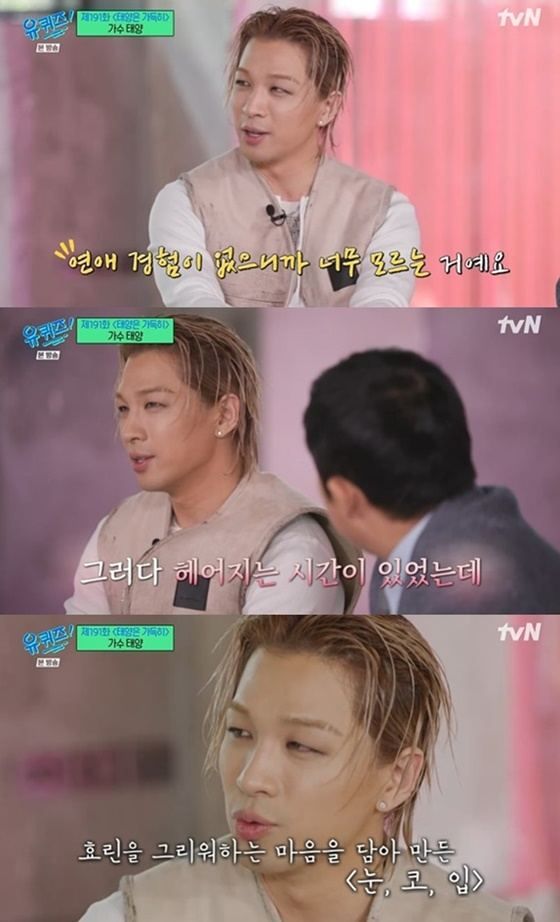 당시 태양은 "너무 바빴고, 한참 월드투어하느라 한국에 있는 시간이 거의 없었던 때다"며 "지금 생각해도 연애 경험이 없으니까 너무 모르는 거다. 그런 부분에 있어서 (민효린이) 답답함도 있었을 거 같다. 그러면서 헤어져 있던 시간이 있었는데 그때 그리워하는 마음을 담아 만든 게 '눈, 코, 입'이다"고 말했다.