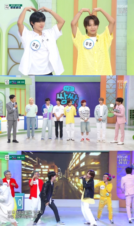 이날 방송에서는 멤버 주한과 우주가 단짝 팀으로 출연해 남다른 입담을 뽐냈다. MC 김재원 아나운서와 가수 김수찬은 이들을 "K팝 샛별", "세계를 뜨겁게 달구는 K팝의 주역"으로 소개했고, 주한은 "할머니와 어머니께서 '아침마당' 애청자이신데 출연하게 돼 꿈만 같다", 우주는 "선배님들 앞에 서게 돼 너무 영광이다"라며 반가운 인사를 전했다.