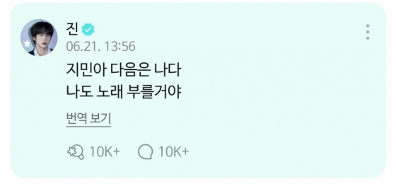 진은 지난 21일 팬 커뮤니티 위버스(Weverse)에 게재된 방탄소년단 멤버 지민의 새 솔로 앨범 트랙리스트 공지에 "지민아 다음은 나다. 나도 노래 부를 거야"라는 댓글을 남기며 팬들의 폭발적인 반응을 불러 일으켰다. 진은 위버스 방탄소년단 공지에 댓글을 자주 달며 소통하는 모습으로 '왕공지둥이'라는 귀여운 별명 또한 가지고 있다. 멤버의 새 솔로 앨범 공지에 댓글을 달며 응원하는 동시에 자신의 솔로 앨범 또한 예고한 것.
