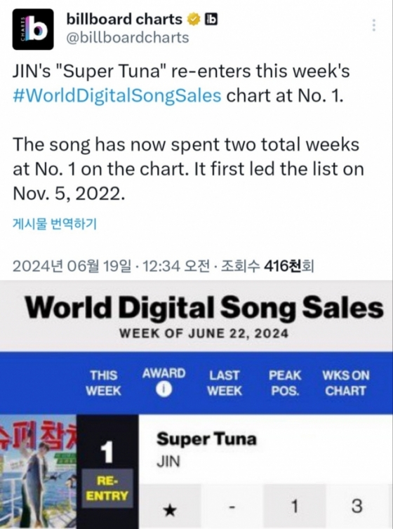 진의 자작곡이자 솔로곡 '슈퍼 참치'(Super Tuna)는 지난 6월 19일 빌보드 차트가 발표한 '월드 디지털 송 세일즈 차트'(Billboard World Digital Song Sales, 6월 22일자)에서 1위로 재진입, 역주행했다. 전역하자마자 빌보드 주요 차트에서 1위를 차지하며 강력한 음원 파워를 빛낸 것.