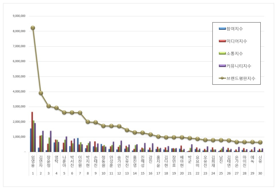 트로트 가수 브랜드평판 1위를 기록한 임영웅 브랜드는 참여지수 1,560,812 미디어지수 2,650,498 소통지수 2,096,739 커뮤니티지수 1,914,030이 되면서 브랜드평판지수 8,222,078로 분석됐다.