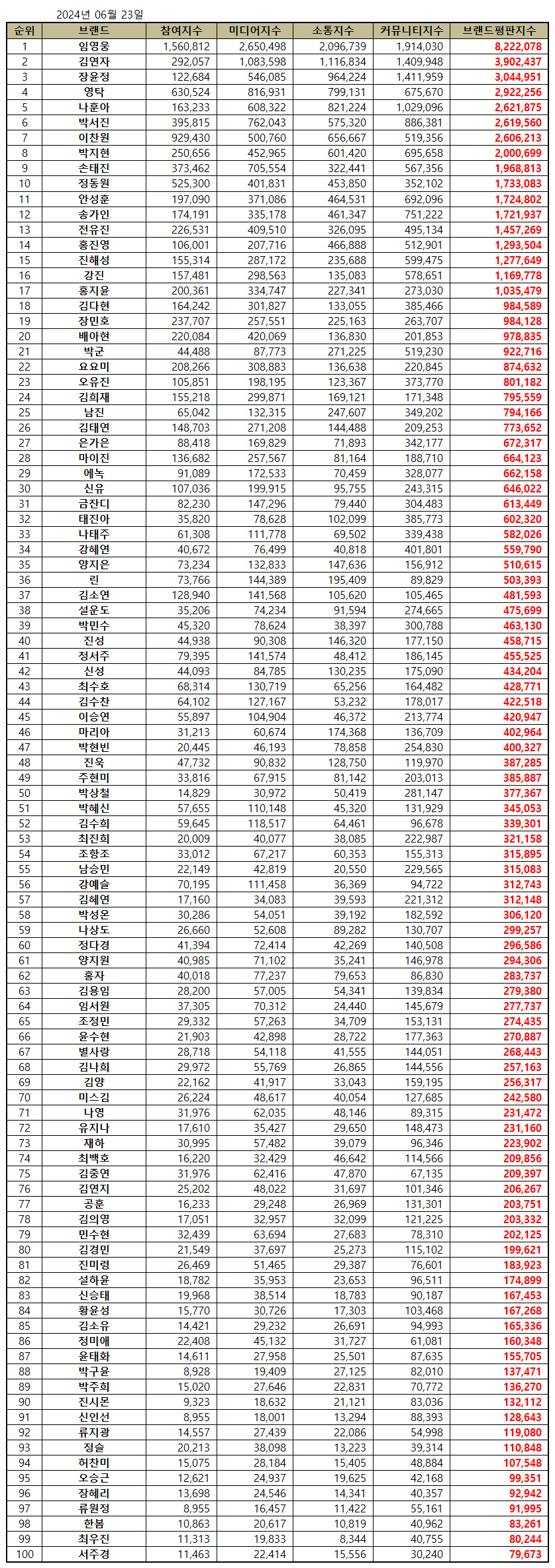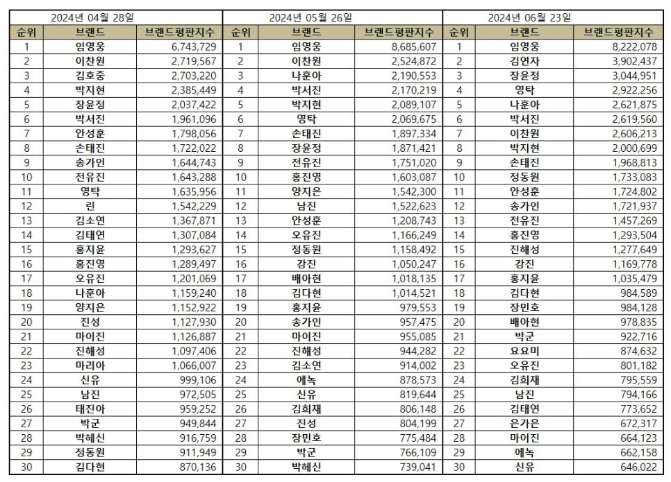 2024년 6월 트로트 가수 브랜드평판 30위 순위는 임영웅, 김연자, 장윤정, 영탁, 나훈아, 박서진, 이찬원, 박지현, 손태진, 정동원, 안성훈, 송가인, 전유진, 홍진영, 진해성, 강진, 홍지윤, 김다현, 장민호, 배아현, 박군, 요요미, 오유진, 김희재, 남진, 김태연, 은가은, 마이진, 에녹, 신유 순으로 분석됐다.