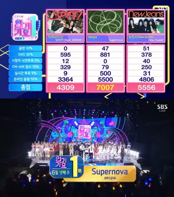 23일 오후 방송된 SBS 음악 프로그램 '인기가요'에서는 ~이 1위를 차지했다. 이날 6월 4주차 1위 후보로 지코 'SPOT!(feat. JENNIE), 에스파 'Supernova', 뉴진스 'How Sweet'이 올랐다.