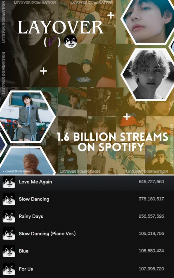 뷔의 첫 솔로앨범 '레이오버'는 6월 24일 스포티파이에서 총 16억 스트리밍을 돌파했다. 지난해 9월 8일 앨범이 발표된 지 289일 만에 세운 기록으로, K팝 솔로 기준 최단 기간 기록이다.