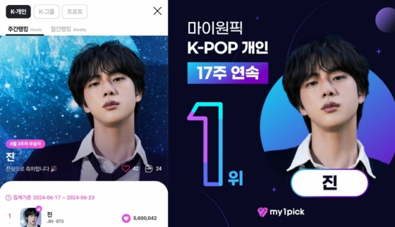 방탄소년단(BTS) 진이 마이원픽 주간랭킹에서 17주 연속 1위를 차지하며 막강한 인기를 빛냈다.