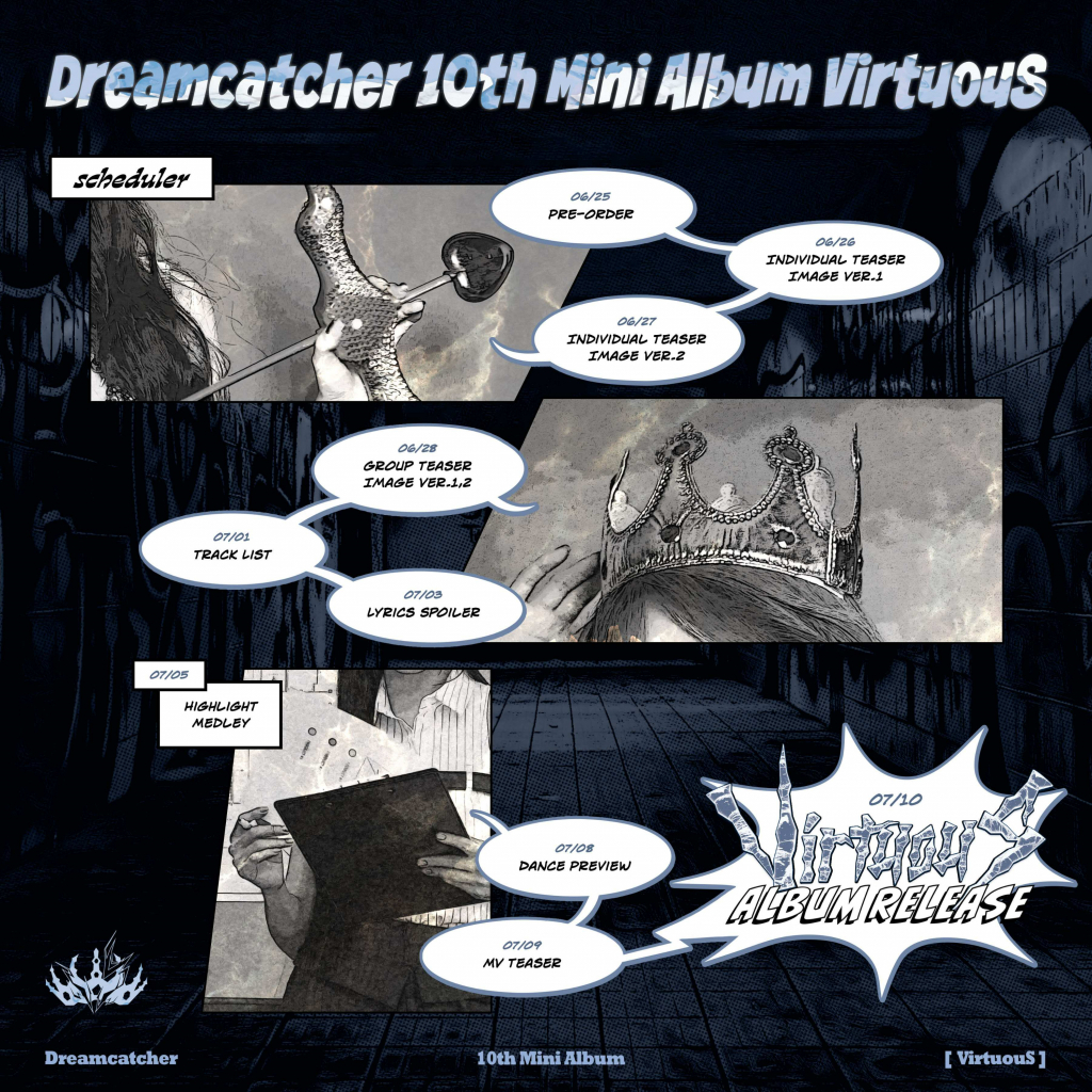 드림캐쳐(지유, 수아, 시연, 한동, 유현, 다미, 가현)는 지난 24일 오후 공식 SNS 채널을 통해 열 번째 미니앨범 'VirtuouS(버추어스)'의 스케줄러를 오픈했다.