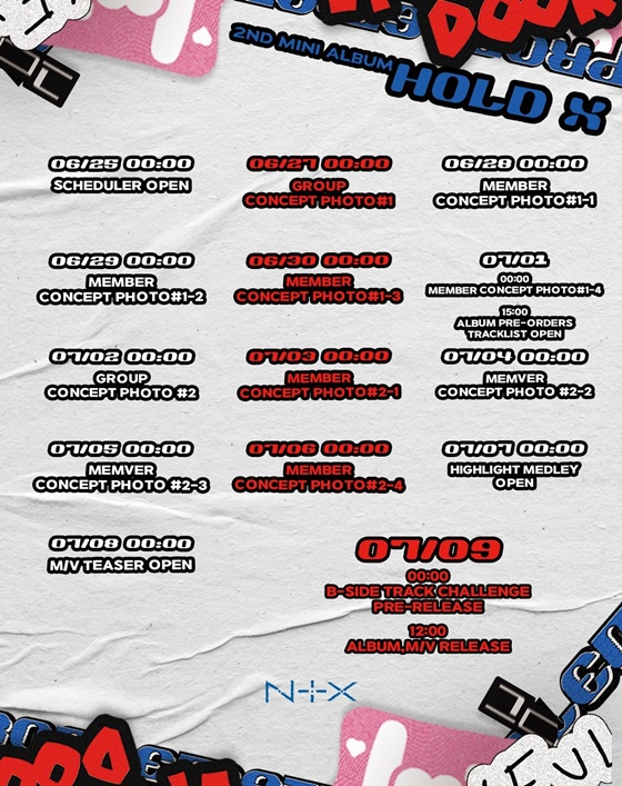 그룹 엔티엑스(형진, 윤혁, 재민, 창훈, 호준, 로현, 은호, 승원)는 25일 자정 공식 SNS를 통해 두 번째 미니앨범 '홀드 엑스(HOLD X)'의 스케줄러를 깜짝 공개하고 7월 컴백을 예고했다.