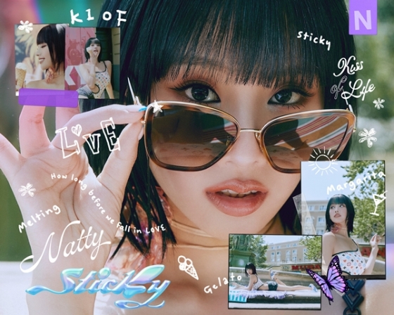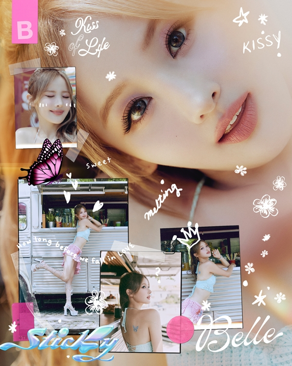 25일 0시 공식 채널을 통해 KISS OF LIFE의 신보 'Sticky' 개인 콘셉트 포토가 오픈됐다. 콜라주로 표현된 여름을 즐기는 각 멤버들의 밝고 싱그러운 모습과 함께 날아다니는 나비, 다양한 손그림과 손글씨로 쓰인 가사 등이 조화를 이루며 보는 이들을 사로잡았다.