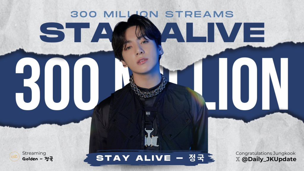 정국은 스포티파이에서 'Stay Alive'를 비롯해 솔로 싱글 'Seven'(세븐), '3D', 솔로 앨범 'GOLDEN'(골든) 타이틀곡 'Standing Next to You'(스탠딩 넥스트 투 유), 미국 싱어송라이터 찰리 푸스와 협업곡 'Left and Right'(레프트 앤드 라이트), '2022년 FIFA(피파) 카타르 월드컵' 공식 사운드트랙 'Dreamers'(드리머스), 방탄소년단 앨범 수록 솔로곡 'Euphoria'(유포리아)까지 3억 스트리밍 곡을 통산 7개 달성했다.