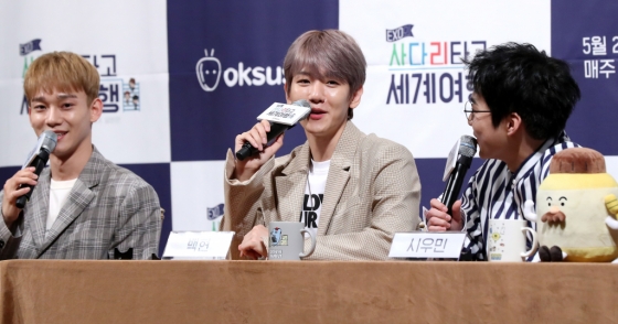그룹 엑소 첸, 백현, 시우민이 29일 오후 서울 논현동 임피리얼팰리스호텔에서 열린 옥수수 예능 '엑소의 사다리 타고 세계여행 - 첸백시 일본편' 제작발표회에 참석하고 있다. 이날 백현과 첸은 "데뷔를 하고 나서 멤버 시우민과는 같이 샤워를 해본 적이 없었는데 이번에도 실패했다"며 "베일에 싸여있는 남자라 너무 궁금하다"고 말했다. /사진=홍봉진기자 honggga@