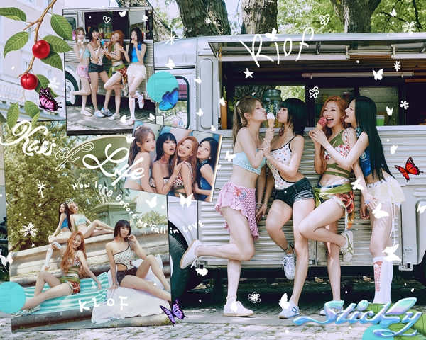 26일 0시 공식 채널을 통해 오픈된 신보 'Sticky' 단체 콘셉트 포토에서는 개성 넘치는 비치웨어를 매치한 KISS OF LIFE 멤버들이 여름을 즐기는 장면을 콜라주 형태로 표현, 자신들만의 눈부신 여름의 순간을 담아냈다.